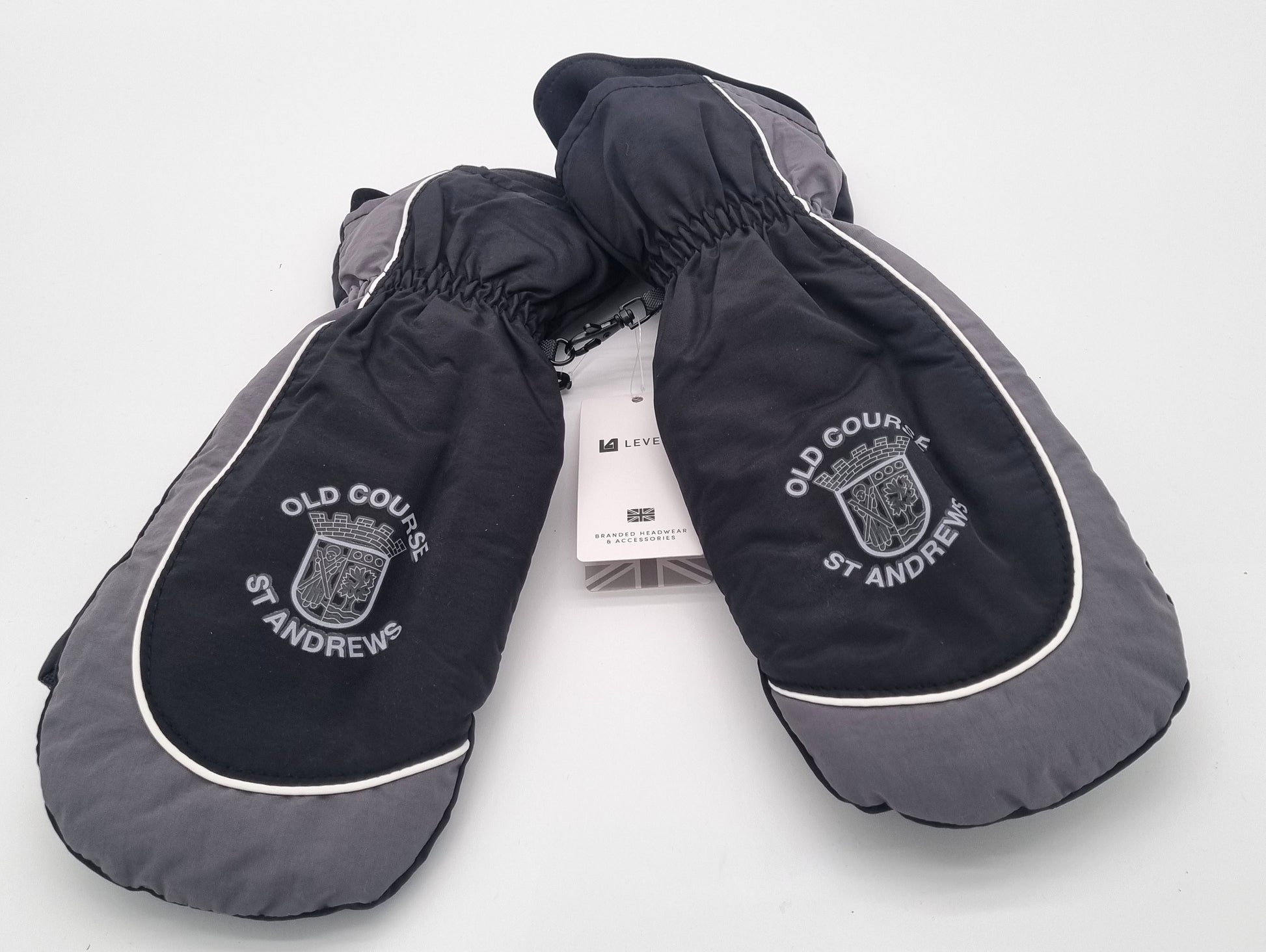 Maintaining feeling and sensitivity in your grip at the optimum level is crucial when the temperature drops. These windproof, showerproof, thermal lined Mittens are performance enhancing. The soft, technically advanced Heatweaver thermal brushed fleece lining recirculates warm air around your hands, sealed in by inner storm cuffs while the wind and showerproof outer stops the weather getting in. For extra heat, you can add hand warmers to specially provided pockets. Attached hanging clips keep the mittens conveniently to hand. Both mitts are crested with the old course St.Andrews logo & come in a black/grey colour with white piping.